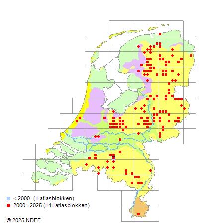 Het aantal atlasblokken (5x5 km) waarin de soort is gemeld binnen een periode van vijf jaar (vanaf 1980) of twintig jaar. Niet gecorrigeerd voor waarnemersinspanning en het aantal doorgegeven waarnemingen kan sterk variëren per periode, dus een trend in verspreiding kan hier niet direct uit worden afgelezen. Het opgegeven jaartal is het eerste jaar van de periode. Bron: gevalideerde waarnemingen uit de NDFF.