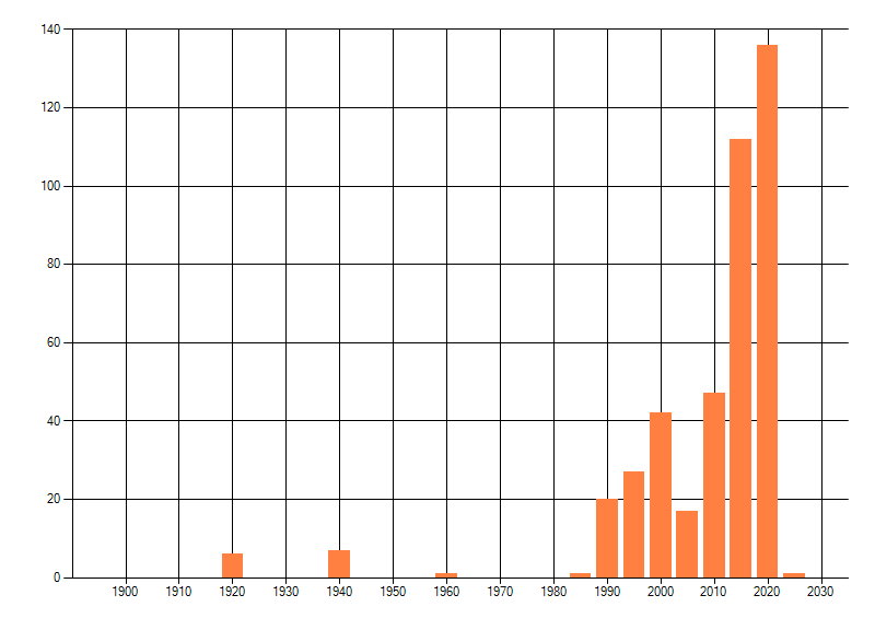 Het aantal atlasblokken (5x5 km) waarin de soort is gemeld binnen een periode van vijf jaar (vanaf 1980) of twintig jaar. Niet gecorrigeerd voor waarnemersinspanning en het aantal doorgegeven waarnemingen kan sterk variëren per periode, dus een trend in verspreiding kan hier niet direct uit worden afgelezen. Het opgegeven jaartal is het eerste jaar van de periode. Bron: gevalideerde waarnemingen uit de NDFF.
