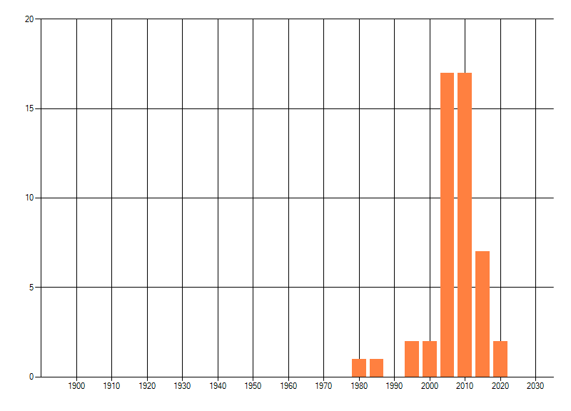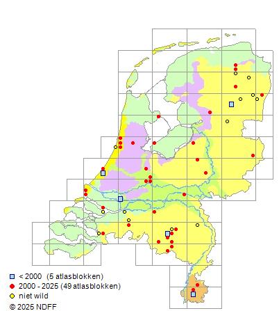 Het aantal atlasblokken (5x5 km) waarin de soort is gemeld binnen een periode van vijf jaar (vanaf 1980) of twintig jaar. Niet gecorrigeerd voor waarnemersinspanning en het aantal doorgegeven waarnemingen kan sterk variëren per periode, dus een trend in verspreiding kan hier niet direct uit worden afgelezen. Het opgegeven jaartal is het eerste jaar van de periode. Bron: gevalideerde waarnemingen uit de NDFF.
