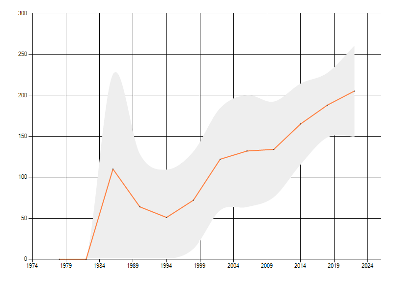 Gemiddelde trend van het aantal kilometerhokken waarin de soort voorkomt, weergegeven als indexcijfer (1975-1978 = 100).