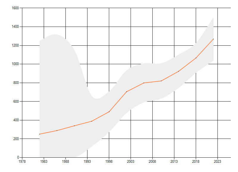 Gemiddelde trend van het aantal kilometerhokken waarin de soort voorkomt, weergegeven als indexcijfer (1975-1978 = 100). De trend is gecorrigeerd voor waarnemersinspanning en geeft de relatieve verandering in het aantal bezette kilometerhokken weer. Voor de berekening worden de data per periode van vier jaar samengenomen. In de grafiek correspondeert ieder punt met het laatste jaar van zo'n periode.
