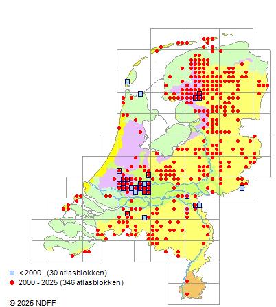Het aantal atlasblokken (5x5 km) waarin de soort is gemeld binnen een periode van vijf jaar (vanaf 1980) of twintig jaar. Niet gecorrigeerd voor waarnemersinspanning en het aantal doorgegeven waarnemingen kan sterk variëren per periode, dus een trend in verspreiding kan hier niet direct uit worden afgelezen. Het opgegeven jaartal is het eerste jaar van de periode. Bron: gevalideerde waarnemingen uit de NDFF.