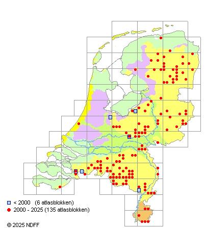 Het aantal atlasblokken (5x5 km) waarin de soort is gemeld binnen een periode van vijf jaar (vanaf 1980) of twintig jaar. Niet gecorrigeerd voor waarnemersinspanning en het aantal doorgegeven waarnemingen kan sterk variëren per periode, dus een trend in verspreiding kan hier niet direct uit worden afgelezen. Het opgegeven jaartal is het eerste jaar van de periode. Bron: gevalideerde waarnemingen uit de NDFF.