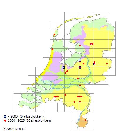 Het aantal atlasblokken (5x5 km) waarin de soort is gemeld binnen een periode van vijf jaar (vanaf 1980) of twintig jaar. Niet gecorrigeerd voor waarnemersinspanning en het aantal doorgegeven waarnemingen kan sterk variëren per periode, dus een trend in verspreiding kan hier niet direct uit worden afgelezen. Het opgegeven jaartal is het eerste jaar van de periode. Bron: gevalideerde waarnemingen uit de NDFF.