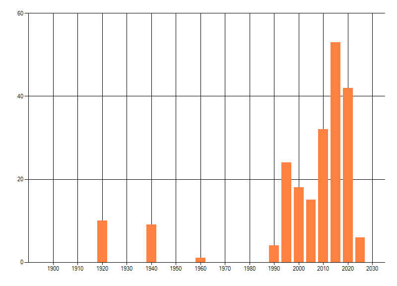 Het aantal atlasblokken (5x5 km) waarin de soort is gemeld binnen een periode van vijf jaar (vanaf 1980) of twintig jaar. Niet gecorrigeerd voor waarnemersinspanning en het aantal doorgegeven waarnemingen kan sterk variëren per periode, dus een trend in verspreiding kan hier niet direct uit worden afgelezen. Het opgegeven jaartal is het eerste jaar van de periode. Bron: gevalideerde waarnemingen uit de NDFF.