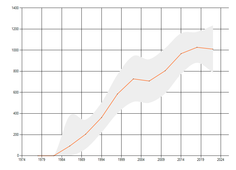 Gemiddelde trend van het aantal kilometerhokken waarin de soort voorkomt, weergegeven als indexcijfer (1975-1978 = 100). De trend is gecorrigeerd voor waarnemersinspanning en geeft de relatieve verandering in het aantal bezette kilometerhokken weer. Voor de berekening worden de data per periode van vier jaar samengenomen. In de grafiek correspondeert ieder punt met het laatste jaar van zo'n periode.