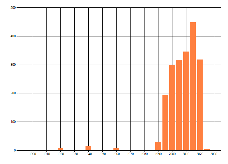 Het aantal atlasblokken (5x5 km) waarin de soort is gemeld binnen een periode van vijf jaar (vanaf 1980) of twintig jaar. Niet gecorrigeerd voor waarnemersinspanning en het aantal doorgegeven waarnemingen kan sterk variëren per periode, dus een trend in verspreiding kan hier niet direct uit worden afgelezen. Het opgegeven jaartal is het eerste jaar van de periode. Bron: gevalideerde waarnemingen uit de NDFF.