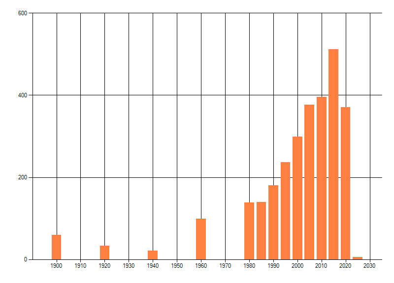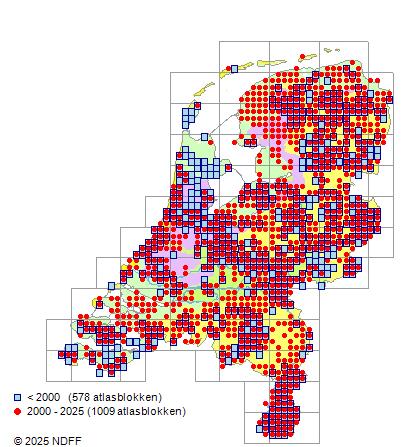 Het aantal atlasblokken (5x5 km) waarin de soort is gemeld binnen een periode van vijf jaar (vanaf 1980) of twintig jaar. Niet gecorrigeerd voor waarnemersinspanning en het aantal doorgegeven waarnemingen kan sterk variëren per periode, dus een trend in verspreiding kan hier niet direct uit worden afgelezen. Het opgegeven jaartal is het eerste jaar van de periode. Bron: gevalideerde waarnemingen uit de NDFF.