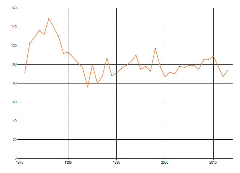 Gemiddelde trend van het aantal kilometerhokken waarin de soort voorkomt, weergegeven als indexcijfer (1975-1978 = 100). De trend is gecorrigeerd voor waarnemersinspanning en geeft de relatieve verandering in het aantal bezette kilometerhokken weer. Voor de berekening worden de data per periode van vier jaar samengenomen. In de grafiek correspondeert ieder punt met het laatste jaar van zo'n periode.