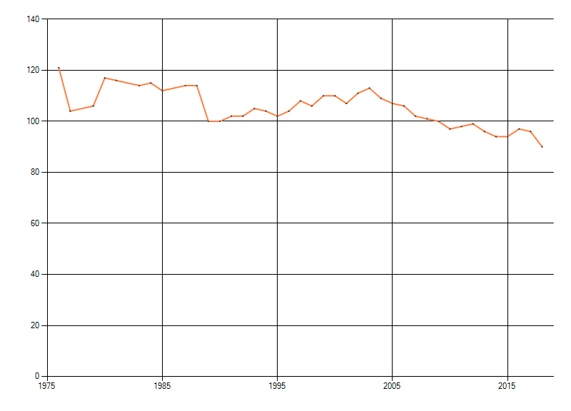 Gemiddelde trend van het aantal kilometerhokken waarin de soort voorkomt, weergegeven als indexcijfer (1975-1978 = 100). De trend is gecorrigeerd voor waarnemersinspanning en geeft de relatieve verandering in het aantal bezette kilometerhokken weer. Voor de berekening worden de data per periode van vier jaar samengenomen. In de grafiek correspondeert ieder punt met het laatste jaar van zo'n periode.