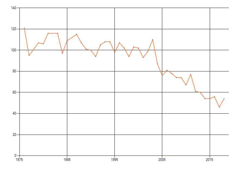 Gemiddelde trend van het aantal kilometerhokken waarin de soort voorkomt, weergegeven als indexcijfer (1975-1978 = 100). De trend is gecorrigeerd voor waarnemersinspanning en geeft de relatieve verandering in het aantal bezette kilometerhokken weer. Voor de berekening worden de data per periode van vier jaar samengenomen. In de grafiek correspondeert ieder punt met het laatste jaar van zo'n periode.
