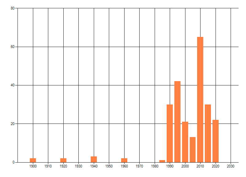 Het aantal atlasblokken (5x5 km) waarin de soort is gemeld binnen een periode van vijf jaar (vanaf 1980) of twintig jaar. Niet gecorrigeerd voor waarnemersinspanning en het aantal doorgegeven waarnemingen kan sterk variëren per periode, dus een trend in verspreiding kan hier niet direct uit worden afgelezen. Het opgegeven jaartal is het eerste jaar van de periode. Bron: gevalideerde waarnemingen uit de NDFF.