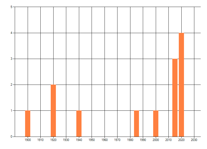Het aantal atlasblokken (5x5 km) waarin de soort is gemeld binnen een periode van vijf jaar (vanaf 1980) of twintig jaar. Niet gecorrigeerd voor waarnemersinspanning en het aantal doorgegeven waarnemingen kan sterk variëren per periode, dus een trend in verspreiding kan hier niet direct uit worden afgelezen. Het opgegeven jaartal is het eerste jaar van de periode. Bron: gevalideerde waarnemingen uit de NDFF.