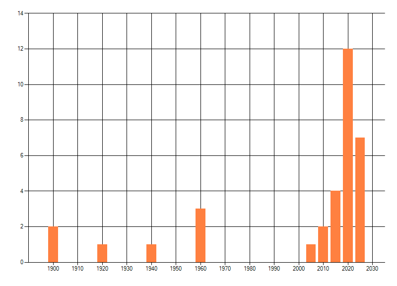 Het aantal atlasblokken (5x5 km) waarin de soort is gemeld binnen een periode van vijf jaar (vanaf 1980) of twintig jaar. Niet gecorrigeerd voor waarnemersinspanning en het aantal doorgegeven waarnemingen kan sterk variëren per periode, dus een trend in verspreiding kan hier niet direct uit worden afgelezen. Het opgegeven jaartal is het eerste jaar van de periode. Bron: gevalideerde waarnemingen uit de NDFF.