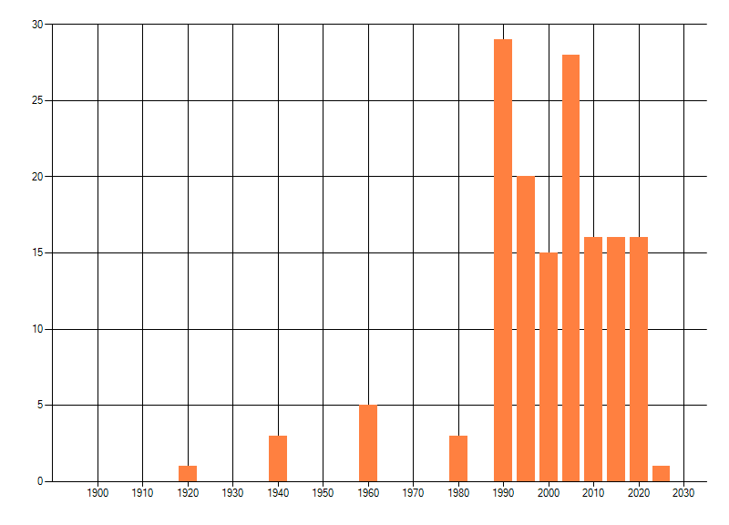 Het aantal atlasblokken (5x5 km) waarin de soort is gemeld binnen een periode van vijf jaar (vanaf 1980) of twintig jaar. Niet gecorrigeerd voor waarnemersinspanning en het aantal doorgegeven waarnemingen kan sterk variëren per periode, dus een trend in verspreiding kan hier niet direct uit worden afgelezen. Het opgegeven jaartal is het eerste jaar van de periode. Bron: gevalideerde waarnemingen uit de NDFF.