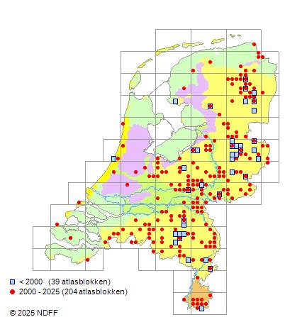 Het aantal atlasblokken (5x5 km) waarin de soort is gemeld binnen een periode van vijf jaar (vanaf 1980) of twintig jaar. Niet gecorrigeerd voor waarnemersinspanning en het aantal doorgegeven waarnemingen kan sterk variëren per periode, dus een trend in verspreiding kan hier niet direct uit worden afgelezen. Het opgegeven jaartal is het eerste jaar van de periode. Bron: gevalideerde waarnemingen uit de NDFF.