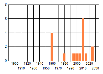 Het aantal atlasblokken (5x5 km) waarin de soort is gemeld binnen een periode van vijf jaar (vanaf 1980) of twintig jaar. Niet gecorrigeerd voor waarnemersinspanning en het aantal doorgegeven waarnemingen kan sterk variëren per periode, dus een trend in verspreiding kan hier niet direct uit worden afgelezen. Het opgegeven jaartal is het eerste jaar van de periode. Bron: gevalideerde waarnemingen uit de NDFF.