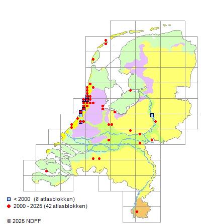 Het aantal atlasblokken (5x5 km) waarin de soort is gemeld binnen een periode van vijf jaar (vanaf 1980) of twintig jaar. Niet gecorrigeerd voor waarnemersinspanning en het aantal doorgegeven waarnemingen kan sterk variëren per periode, dus een trend in verspreiding kan hier niet direct uit worden afgelezen. Het opgegeven jaartal is het eerste jaar van de periode. Bron: gevalideerde waarnemingen uit de NDFF.