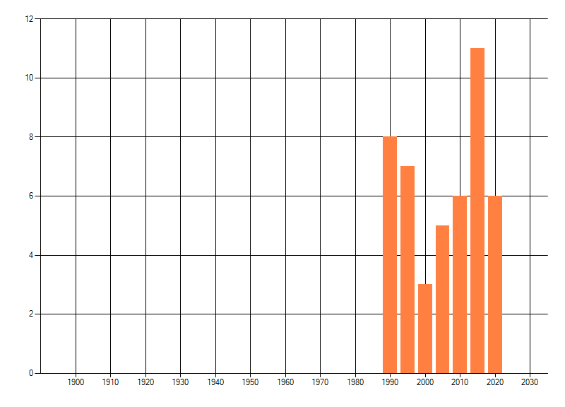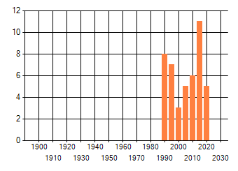 Het aantal atlasblokken (5x5 km) waarin de soort is gemeld binnen een periode van vijf jaar (vanaf 1980) of twintig jaar. Niet gecorrigeerd voor waarnemersinspanning en het aantal doorgegeven waarnemingen kan sterk variëren per periode, dus een trend in verspreiding kan hier niet direct uit worden afgelezen. Het opgegeven jaartal is het eerste jaar van de periode. Bron: gevalideerde waarnemingen uit de NDFF.