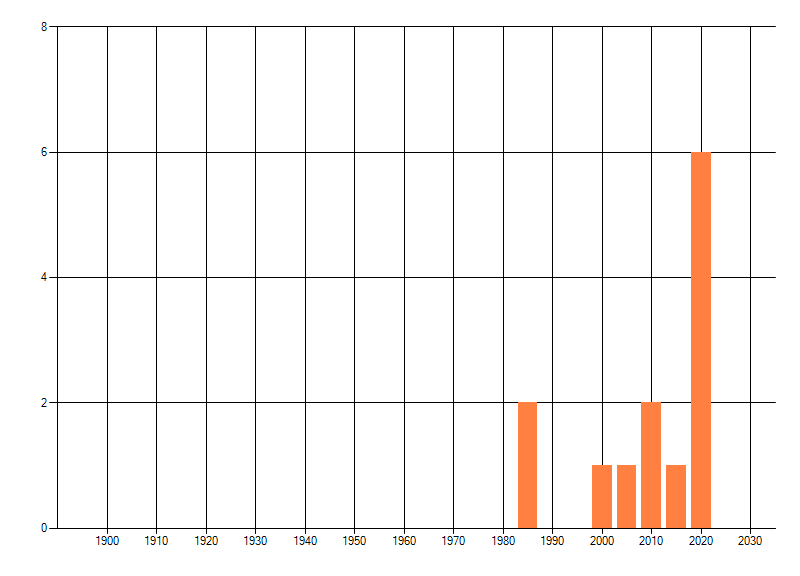 Het aantal atlasblokken (5x5 km) waarin de soort is gemeld binnen een periode van vijf jaar (vanaf 1980) of twintig jaar. Niet gecorrigeerd voor waarnemersinspanning en het aantal doorgegeven waarnemingen kan sterk variëren per periode, dus een trend in verspreiding kan hier niet direct uit worden afgelezen. Het opgegeven jaartal is het eerste jaar van de periode. Bron: gevalideerde waarnemingen uit de NDFF.