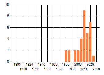 Het aantal atlasblokken (5x5 km) waarin de soort is gemeld binnen een periode van vijf jaar (vanaf 1980) of twintig jaar. Niet gecorrigeerd voor waarnemersinspanning en het aantal doorgegeven waarnemingen kan sterk variëren per periode, dus een trend in verspreiding kan hier niet direct uit worden afgelezen. Het opgegeven jaartal is het eerste jaar van de periode. Bron: gevalideerde waarnemingen uit de NDFF.
