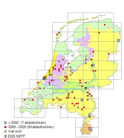 Het aantal atlasblokken (5x5 km) waarin de soort is gemeld binnen een periode van vijf jaar (vanaf 1980) of twintig jaar. Niet gecorrigeerd voor waarnemersinspanning en het aantal doorgegeven waarnemingen kan sterk variëren per periode, dus een trend in verspreiding kan hier niet direct uit worden afgelezen. Het opgegeven jaartal is het eerste jaar van de periode. Bron: gevalideerde waarnemingen uit de NDFF.