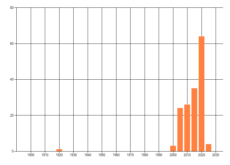 Het aantal atlasblokken (5x5 km) waarin de soort is gemeld binnen een periode van vijf jaar (vanaf 1980) of twintig jaar. Niet gecorrigeerd voor waarnemersinspanning en het aantal doorgegeven waarnemingen kan sterk variëren per periode, dus een trend in verspreiding kan hier niet direct uit worden afgelezen. Het opgegeven jaartal is het eerste jaar van de periode. Bron: gevalideerde waarnemingen uit de NDFF.