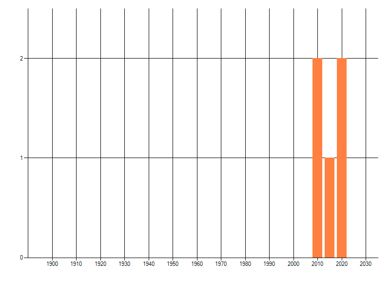 Het aantal atlasblokken (5x5 km) waarin de soort is gemeld binnen een periode van vijf jaar (vanaf 1980) of twintig jaar. Niet gecorrigeerd voor waarnemersinspanning en het aantal doorgegeven waarnemingen kan sterk variëren per periode, dus een trend in verspreiding kan hier niet direct uit worden afgelezen. Het opgegeven jaartal is het eerste jaar van de periode. Bron: gevalideerde waarnemingen uit de NDFF.