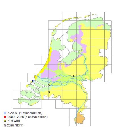 Het aantal atlasblokken (5x5 km) waarin de soort is gemeld binnen een periode van vijf jaar (vanaf 1980) of twintig jaar. Niet gecorrigeerd voor waarnemersinspanning en het aantal doorgegeven waarnemingen kan sterk variëren per periode, dus een trend in verspreiding kan hier niet direct uit worden afgelezen. Het opgegeven jaartal is het eerste jaar van de periode. Bron: gevalideerde waarnemingen uit de NDFF.