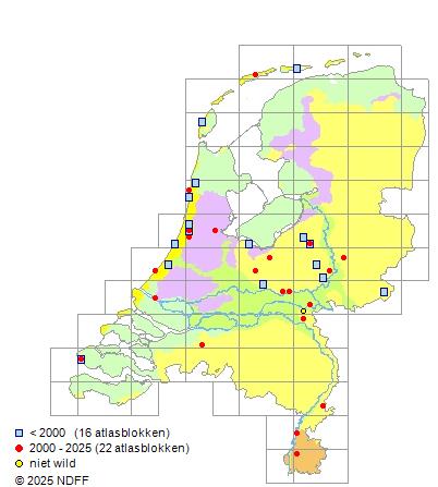 Het aantal atlasblokken (5x5 km) waarin de soort is gemeld binnen een periode van vijf jaar (vanaf 1980) of twintig jaar. Niet gecorrigeerd voor waarnemersinspanning en het aantal doorgegeven waarnemingen kan sterk variëren per periode, dus een trend in verspreiding kan hier niet direct uit worden afgelezen. Het opgegeven jaartal is het eerste jaar van de periode. Bron: gevalideerde waarnemingen uit de NDFF.