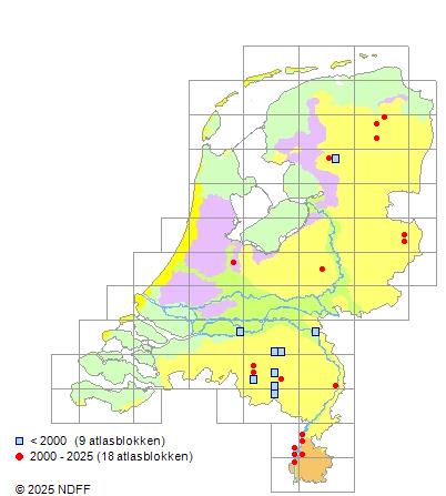 Het aantal atlasblokken (5x5 km) waarin de soort is gemeld binnen een periode van vijf jaar (vanaf 1980) of twintig jaar. Niet gecorrigeerd voor waarnemersinspanning en het aantal doorgegeven waarnemingen kan sterk variëren per periode, dus een trend in verspreiding kan hier niet direct uit worden afgelezen. Het opgegeven jaartal is het eerste jaar van de periode. Bron: gevalideerde waarnemingen uit de NDFF.
