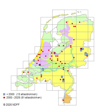 Het aantal atlasblokken (5x5 km) waarin de soort is gemeld binnen een periode van vijf jaar (vanaf 1980) of twintig jaar. Niet gecorrigeerd voor waarnemersinspanning en het aantal doorgegeven waarnemingen kan sterk variëren per periode, dus een trend in verspreiding kan hier niet direct uit worden afgelezen. Het opgegeven jaartal is het eerste jaar van de periode. Bron: gevalideerde waarnemingen uit de NDFF.