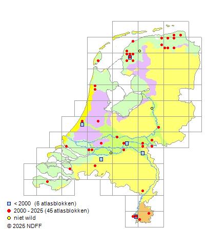 Het aantal atlasblokken (5x5 km) waarin de soort is gemeld binnen een periode van vijf jaar (vanaf 1980) of twintig jaar. Niet gecorrigeerd voor waarnemersinspanning en het aantal doorgegeven waarnemingen kan sterk variëren per periode, dus een trend in verspreiding kan hier niet direct uit worden afgelezen. Het opgegeven jaartal is het eerste jaar van de periode. Bron: gevalideerde waarnemingen uit de NDFF.