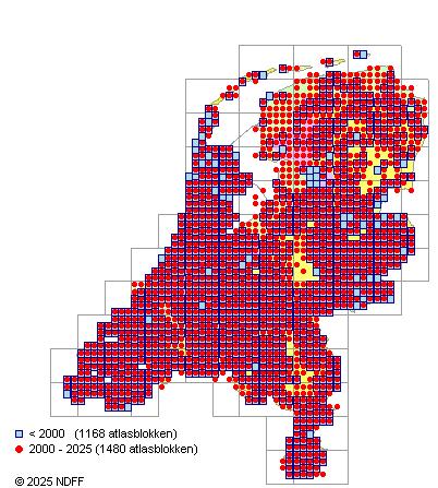 Het aantal atlasblokken (5x5 km) waarin de soort is gemeld binnen een periode van vijf jaar (vanaf 1980) of twintig jaar. Niet gecorrigeerd voor waarnemersinspanning en het aantal doorgegeven waarnemingen kan sterk variëren per periode, dus een trend in verspreiding kan hier niet direct uit worden afgelezen. Het opgegeven jaartal is het eerste jaar van de periode. Bron: gevalideerde waarnemingen uit de NDFF.