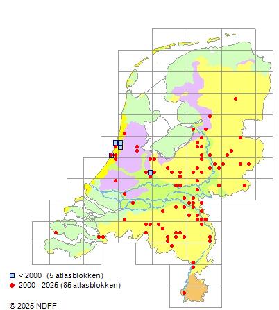 Het aantal atlasblokken (5x5 km) waarin de soort is gemeld binnen een periode van vijf jaar (vanaf 1980) of twintig jaar. Niet gecorrigeerd voor waarnemersinspanning en het aantal doorgegeven waarnemingen kan sterk variëren per periode, dus een trend in verspreiding kan hier niet direct uit worden afgelezen. Het opgegeven jaartal is het eerste jaar van de periode. Bron: gevalideerde waarnemingen uit de NDFF.