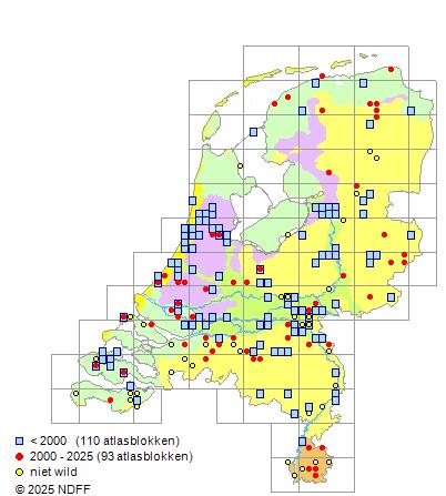 Het aantal atlasblokken (5x5 km) waarin de soort is gemeld binnen een periode van vijf jaar (vanaf 1980) of twintig jaar. Niet gecorrigeerd voor waarnemersinspanning en het aantal doorgegeven waarnemingen kan sterk variëren per periode, dus een trend in verspreiding kan hier niet direct uit worden afgelezen. Het opgegeven jaartal is het eerste jaar van de periode. Bron: gevalideerde waarnemingen uit de NDFF.