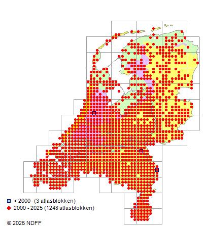 CC BY-NC-SA 3.0 NLVerspreidingNederlandZeldzaam in stedelijke gebieden en in het rivierengebied. Ingeburgerd tussen 1975 en 1999.