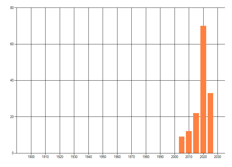 Het aantal atlasblokken (5x5 km) waarin de soort is gemeld binnen een periode van vijf jaar (vanaf 1980) of twintig jaar. Niet gecorrigeerd voor waarnemersinspanning en het aantal doorgegeven waarnemingen kan sterk variëren per periode, dus een trend in verspreiding kan hier niet direct uit worden afgelezen. Het opgegeven jaartal is het eerste jaar van de periode. Bron: gevalideerde waarnemingen uit de NDFF.