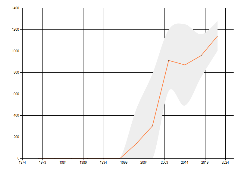 Gemiddelde trend van het aantal kilometerhokken waarin de soort voorkomt, weergegeven als indexcijfer (1975-1978 = 100).