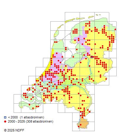 CC BY-NC-SA 3.0 NLVerspreidingNederlandZeldzaam, maar zich uitbreidend. Ingeburgerd tussen 1975 en 1999.