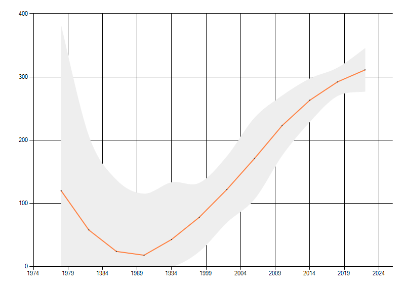 Gemiddelde trend van het aantal kilometerhokken waarin de soort voorkomt, weergegeven als indexcijfer (1975-1978 = 100). De trend is gecorrigeerd voor waarnemersinspanning en geeft de relatieve verandering in het aantal bezette kilometerhokken weer. Voor de berekening worden de data per periode van vier jaar samengenomen. In de grafiek correspondeert ieder punt met het laatste jaar van zo'n periode.