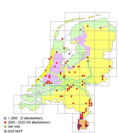 Het aantal atlasblokken (5x5 km) waarin de soort is gemeld binnen een periode van vijf jaar (vanaf 1980) of twintig jaar. Niet gecorrigeerd voor waarnemersinspanning en het aantal doorgegeven waarnemingen kan sterk variƫren per periode, dus een trend in verspreiding kan hier niet direct uit worden afgelezen. Het opgegeven jaartal is het eerste jaar van de periode. Bron: gevalideerde waarnemingen uit de NDFF.