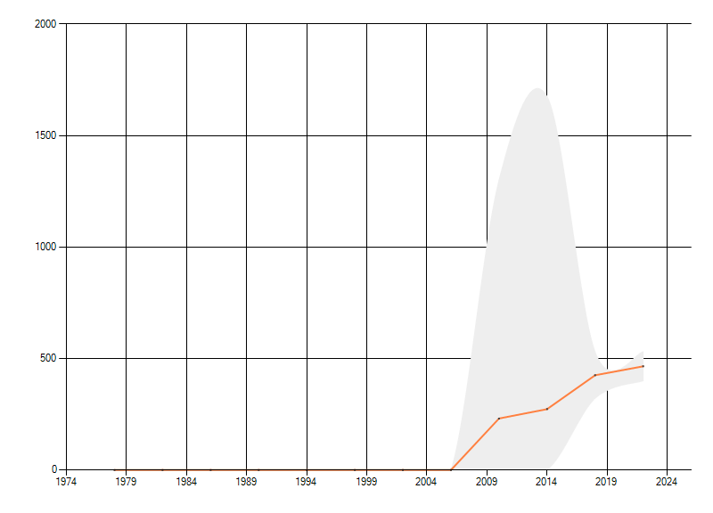 Gemiddelde trend van het aantal kilometerhokken waarin de soort voorkomt, weergegeven als indexcijfer (1975-1978 = 100). De trend is gecorrigeerd voor waarnemersinspanning en geeft de relatieve verandering in het aantal bezette kilometerhokken weer. Voor de berekening worden de data per periode van vier jaar samengenomen. In de grafiek correspondeert ieder punt met het laatste jaar van zo'n periode.