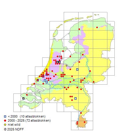 Het aantal atlasblokken (5x5 km) waarin de soort is gemeld binnen een periode van vijf jaar (vanaf 1980) of twintig jaar. Niet gecorrigeerd voor waarnemersinspanning en het aantal doorgegeven waarnemingen kan sterk variëren per periode, dus een trend in verspreiding kan hier niet direct uit worden afgelezen. Het opgegeven jaartal is het eerste jaar van de periode. Bron: gevalideerde waarnemingen uit de NDFF.