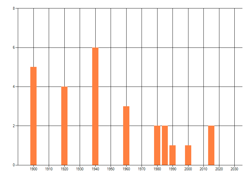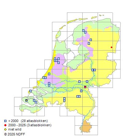 Het aantal atlasblokken (5x5 km) waarin de soort is gemeld binnen een periode van vijf jaar (vanaf 1980) of twintig jaar. Niet gecorrigeerd voor waarnemersinspanning en het aantal doorgegeven waarnemingen kan sterk variëren per periode, dus een trend in verspreiding kan hier niet direct uit worden afgelezen. Het opgegeven jaartal is het eerste jaar van de periode. Bron: gevalideerde waarnemingen uit de NDFF.
