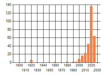 Het aantal atlasblokken (5x5 km) waarin de soort is gemeld binnen een periode van vijf jaar (vanaf 1980) of twintig jaar. Niet gecorrigeerd voor waarnemersinspanning en het aantal doorgegeven waarnemingen kan sterk variëren per periode, dus een trend in verspreiding kan hier niet direct uit worden afgelezen. Het opgegeven jaartal is het eerste jaar van de periode. Bron: gevalideerde waarnemingen uit de NDFF.