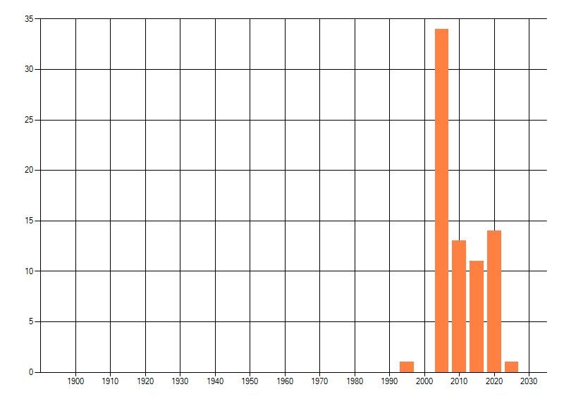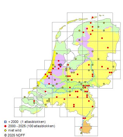 Het aantal atlasblokken (5x5 km) waarin de soort is gemeld binnen een periode van vijf jaar (vanaf 1980) of twintig jaar. Niet gecorrigeerd voor waarnemersinspanning en het aantal doorgegeven waarnemingen kan sterk variƫren per periode, dus een trend in verspreiding kan hier niet direct uit worden afgelezen. Het opgegeven jaartal is het eerste jaar van de periode. Bron: gevalideerde waarnemingen uit de NDFF.