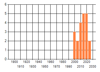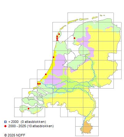 Het aantal atlasblokken (5x5 km) waarin de soort is gemeld binnen een periode van vijf jaar (vanaf 1980) of twintig jaar. Niet gecorrigeerd voor waarnemersinspanning en het aantal doorgegeven waarnemingen kan sterk variëren per periode, dus een trend in verspreiding kan hier niet direct uit worden afgelezen. Het opgegeven jaartal is het eerste jaar van de periode. Bron: gevalideerde waarnemingen uit de NDFF.