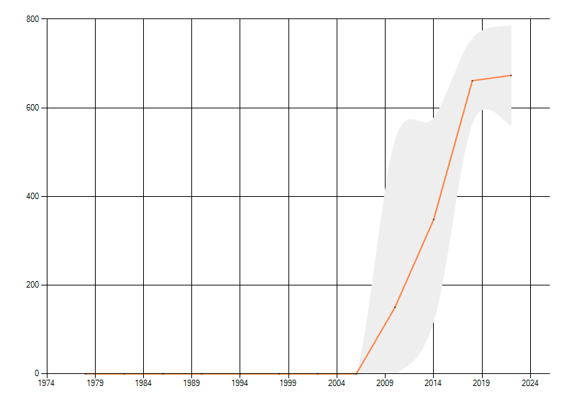 Gemiddelde trend van het aantal kilometerhokken waarin de soort voorkomt, weergegeven als indexcijfer (1975-1978 = 100). De trend is gecorrigeerd voor waarnemersinspanning en geeft de relatieve verandering in het aantal bezette kilometerhokken weer. Voor de berekening worden de data per periode van vier jaar samengenomen. In de grafiek correspondeert ieder punt met het laatste jaar van zo'n periode.