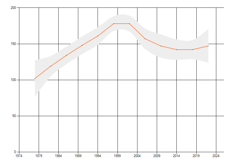Gemiddelde trend van het aantal kilometerhokken waarin de soort voorkomt, weergegeven als indexcijfer (1975-1978 = 100). De trend is gecorrigeerd voor waarnemersinspanning en geeft de relatieve verandering in het aantal bezette kilometerhokken weer. Voor de berekening worden de data per periode van vier jaar samengenomen. In de grafiek correspondeert ieder punt met het laatste jaar van zo'n periode.